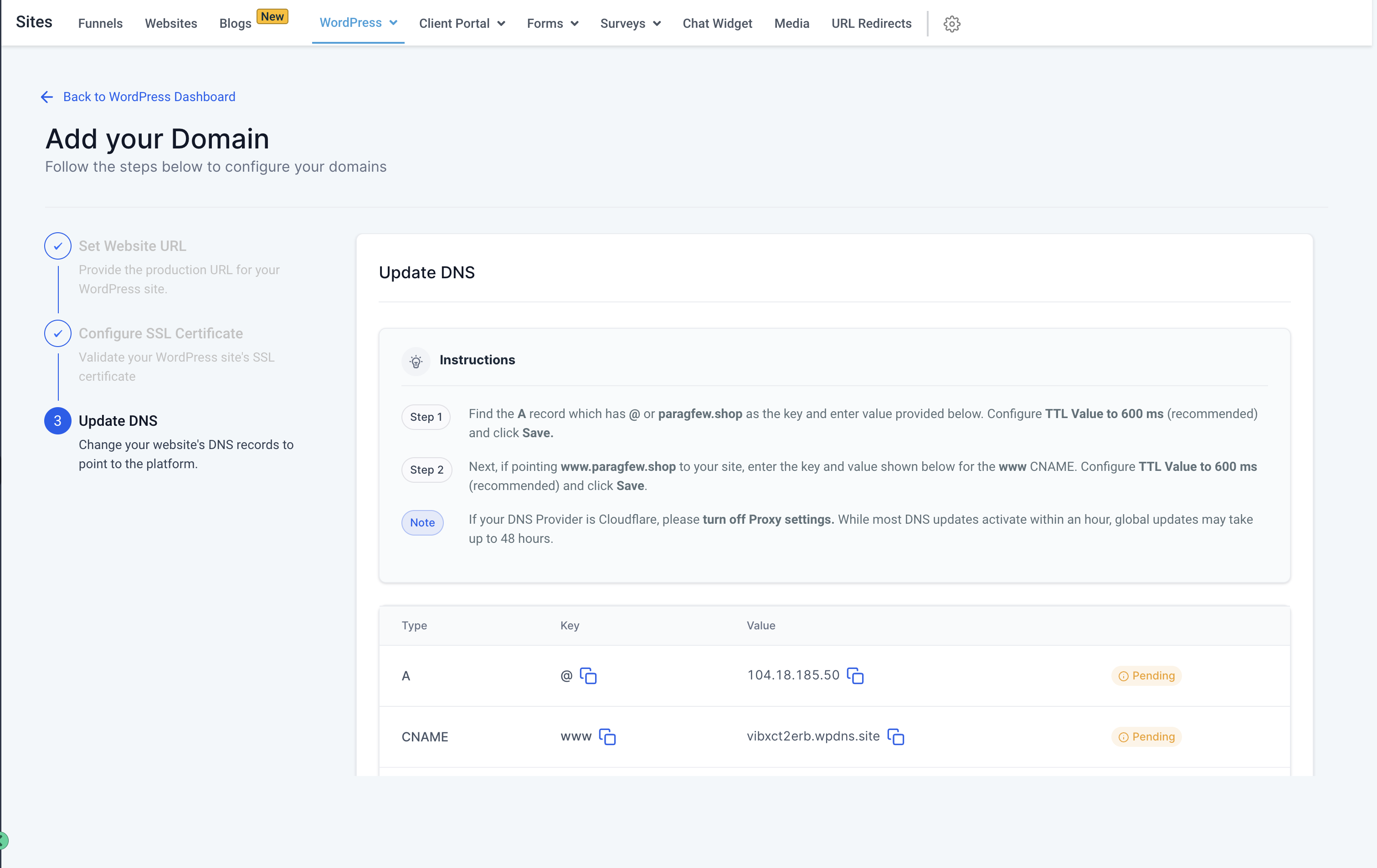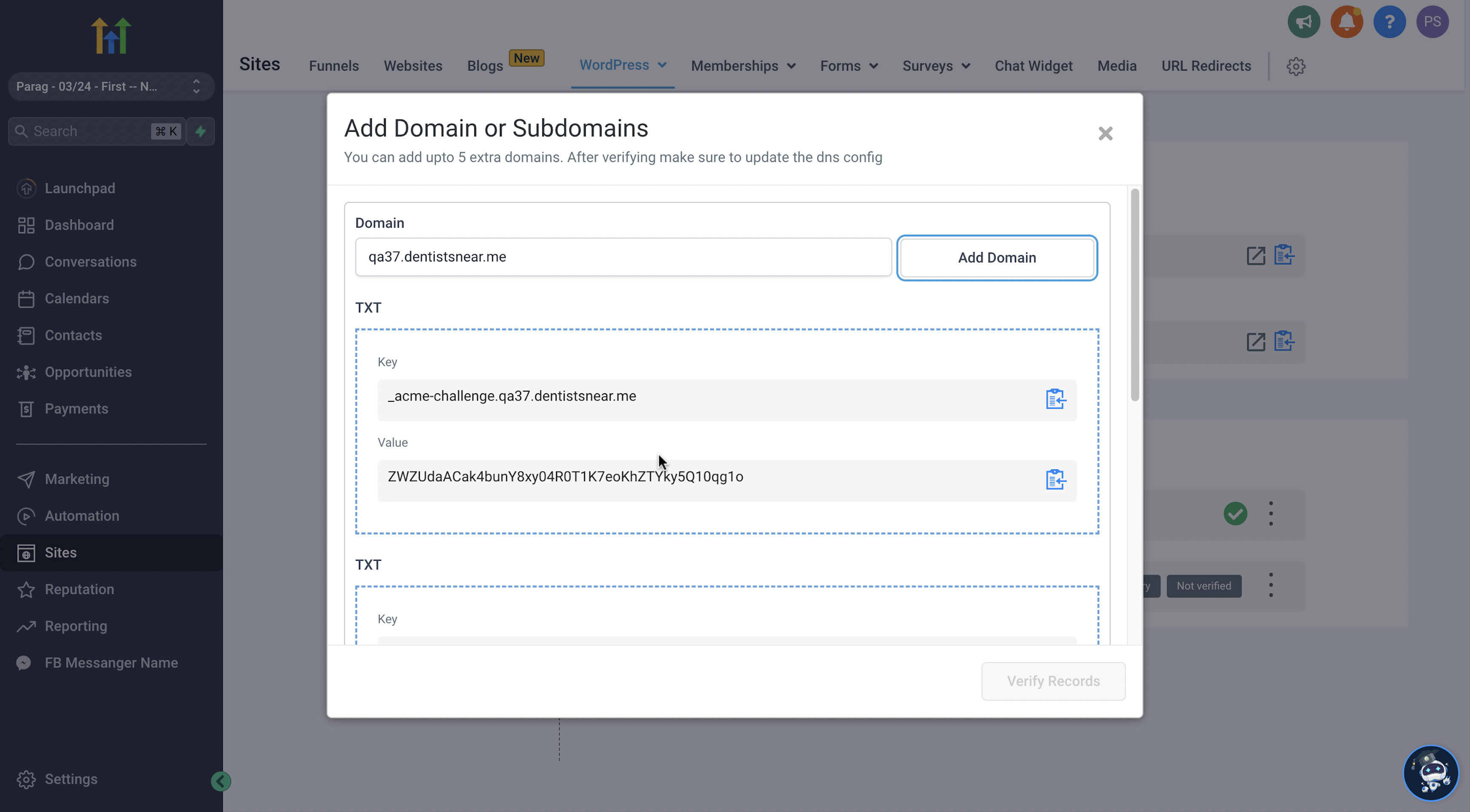 1) When a user tries to add a Sub-Domain, Configure the 2 TXT records generated with your DNS Provider.
