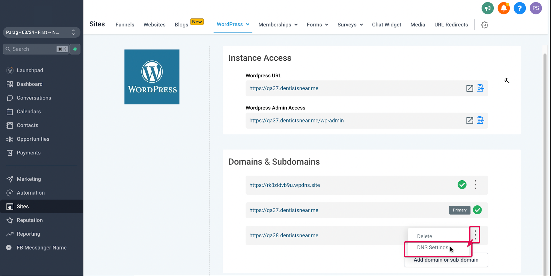 4. Click on DNS Settings to add your credentials to your domain hosting platform