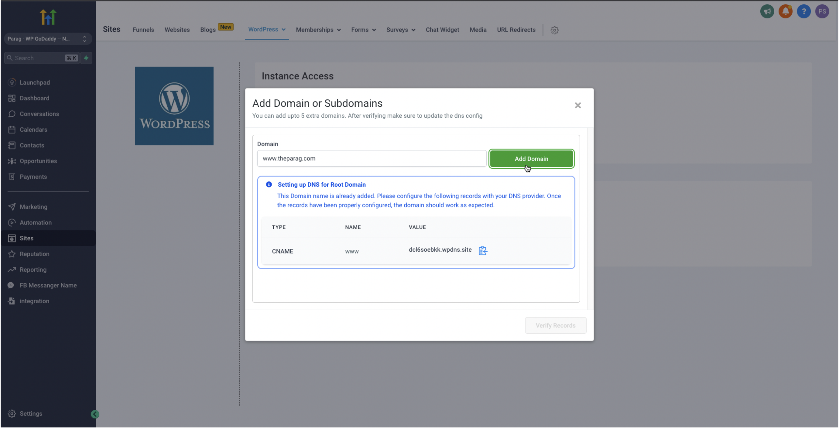 2) In an alternative scenario when a user tries to add a root domain namely - theparag.com, when there already is a domain existing as www.theparag.com, the user will get an A-Record which they can configure in their DNS Provider