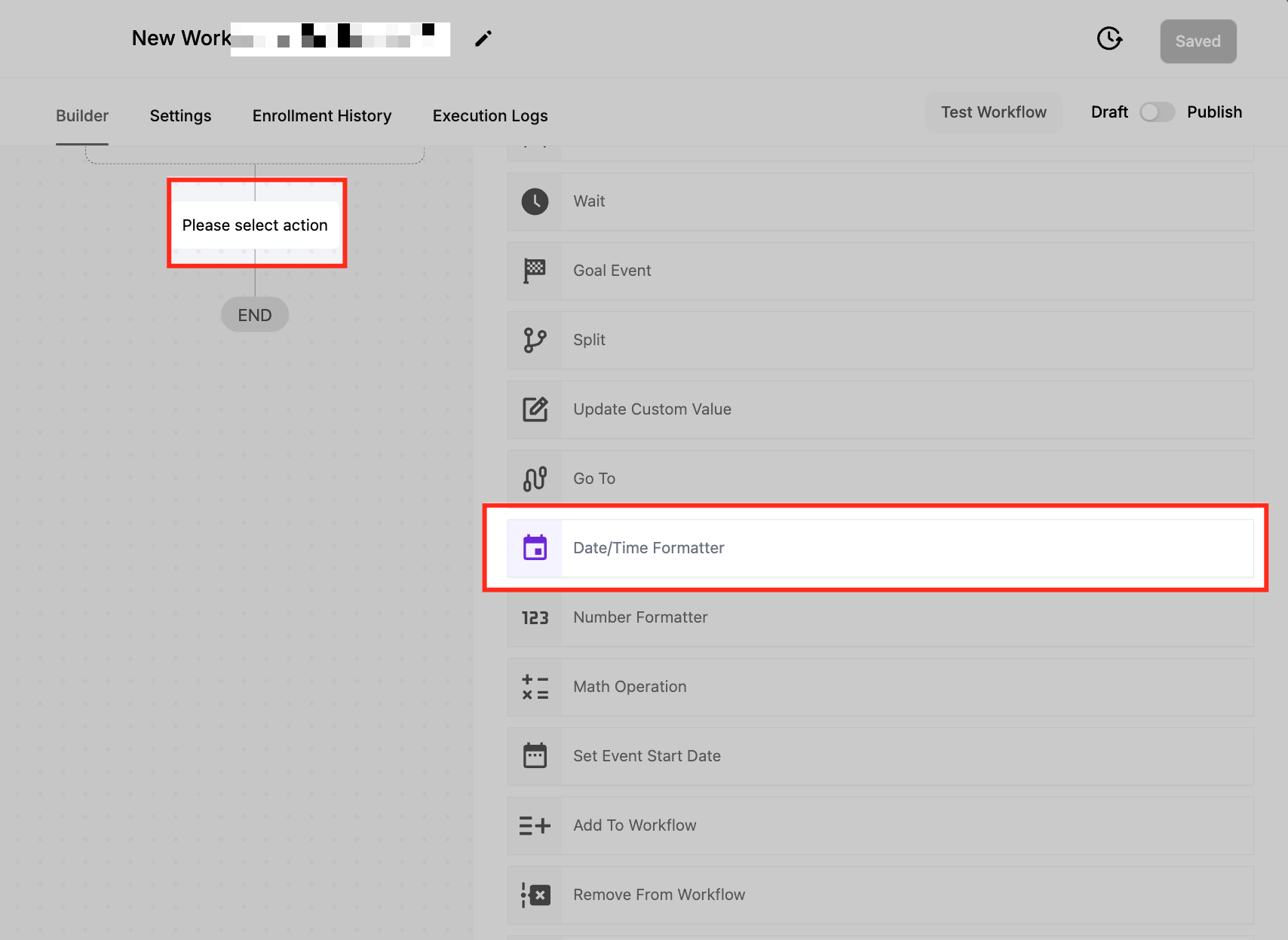 Click the "+" icon to view the list of workflow actions, seect "Date/Time Formatter" from the list.