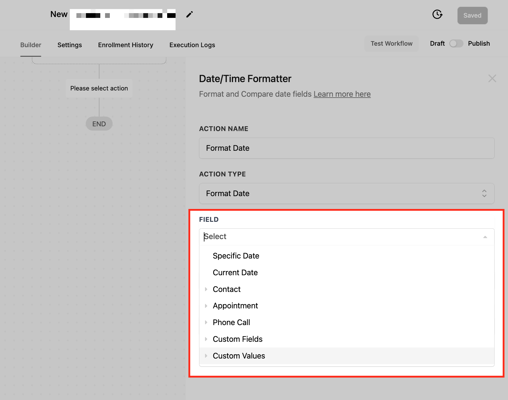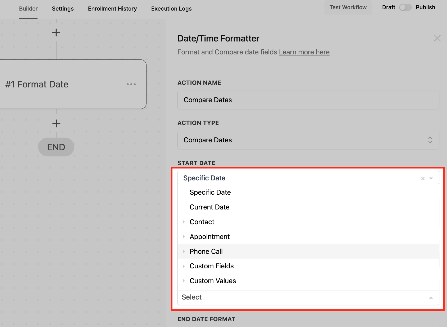 Choose the date field you want to reformat. You can select various sources such as a Specific Date, Current Date, Contact's date fields, date type custom fields, Appointment start/end date, Custom values, or even from an Inbound Webhook Trigger.