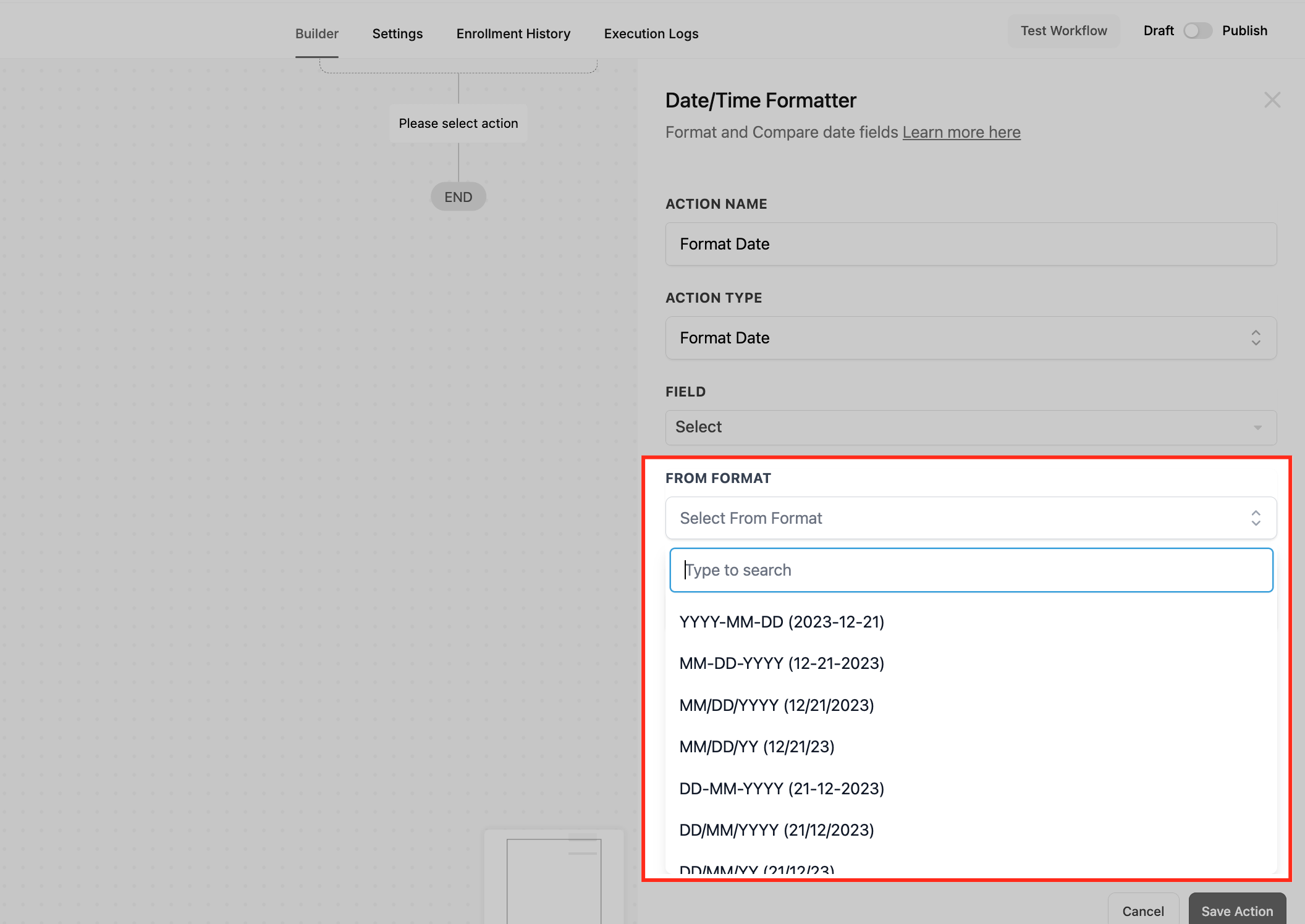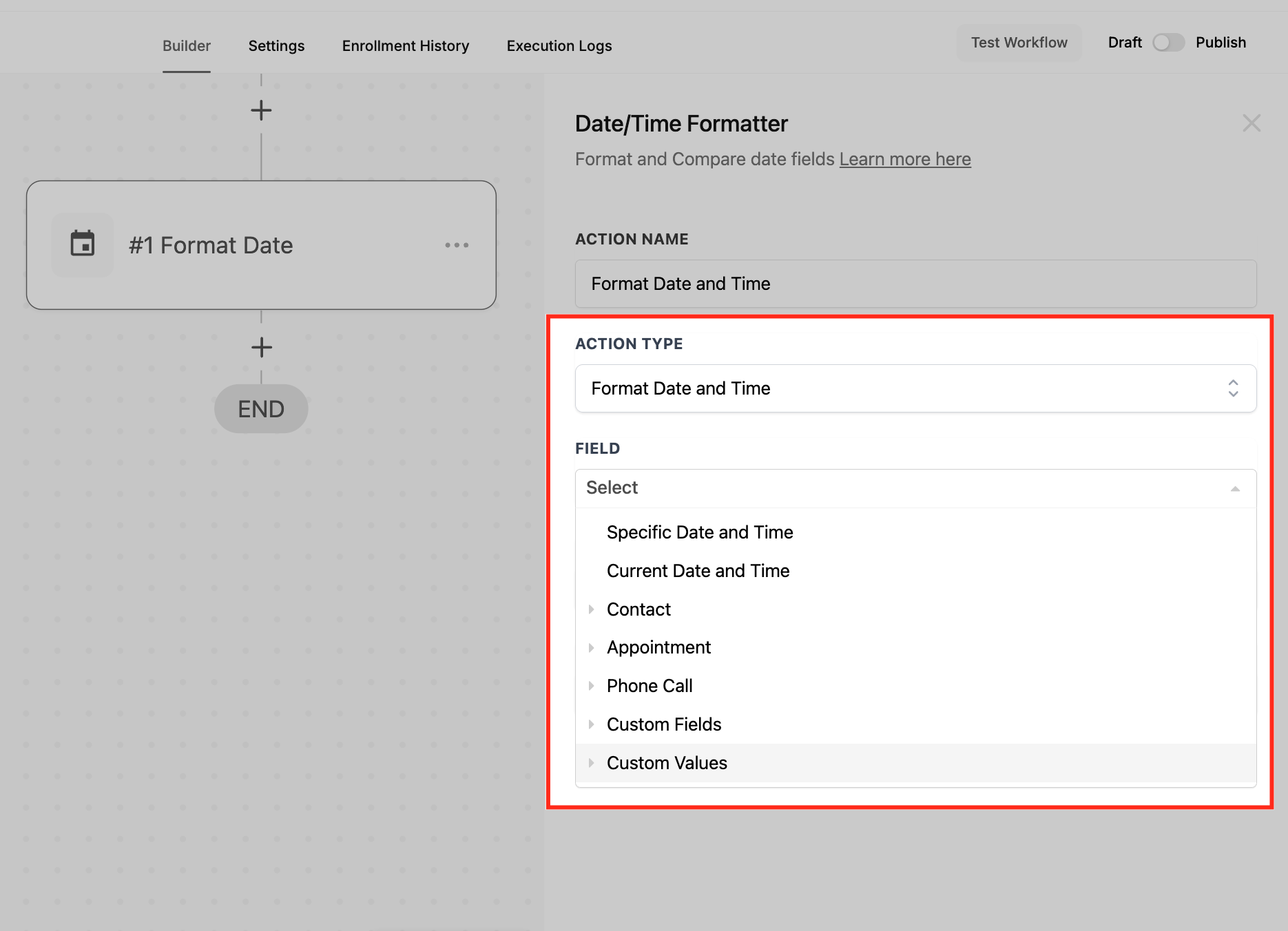 If you select a system field like Specific Date, Current Date, Contact's date type standard or custom fields, or Appointment start/end date, the tool will auto-detect the format and preselect it. You must manually select the matching format if you choose a Custom Value or an Inbound Webhook Trigger.