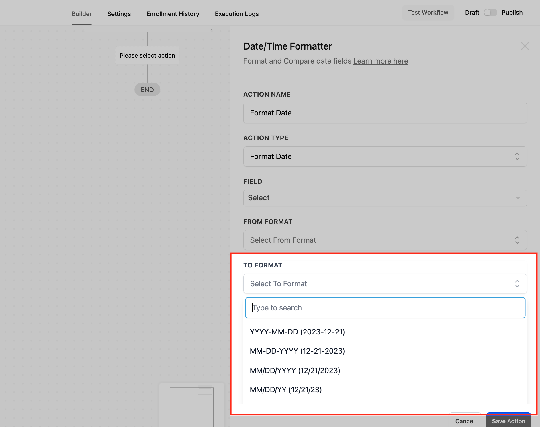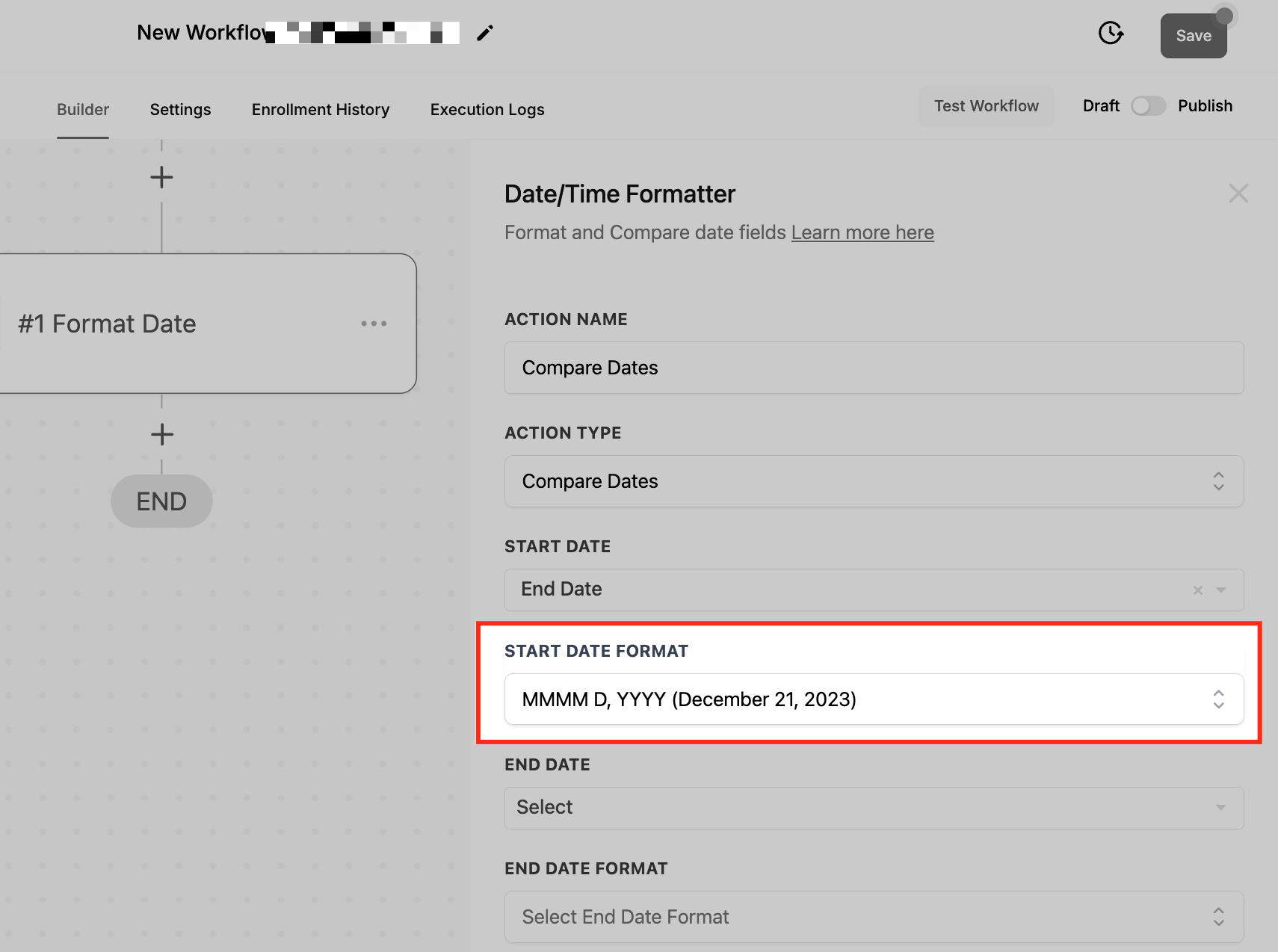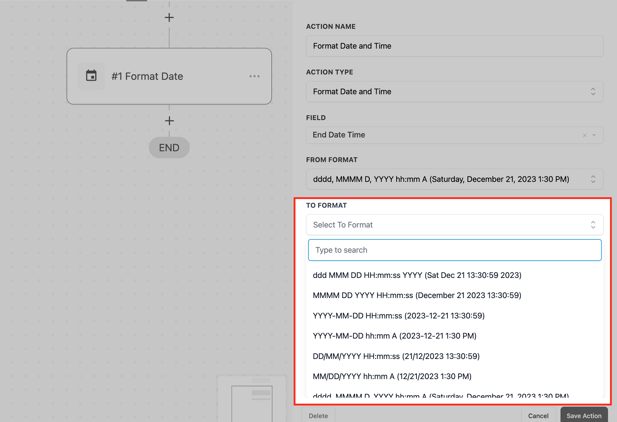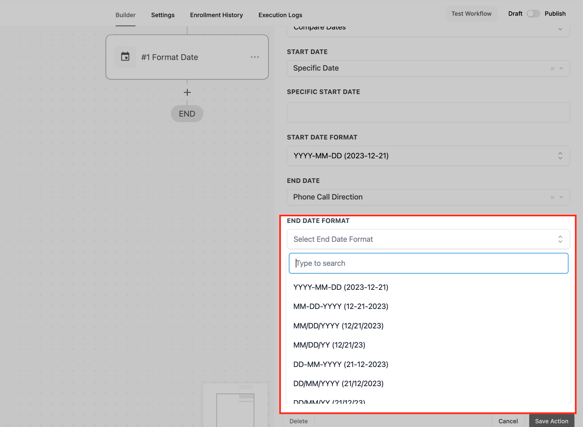 Like the start date format, the tool will auto-detect the format and preselect it if you choose a system field. You must manually select the matching format for Custom Value or Inbound Webhook Trigger.